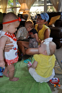 You are getting very close to those first steps, you stand up on everything and you have learned to let go. You just stand there for many second before you either grab on to something again or fall on your tush. We love to watch as you hold onto anything and walk to get closer to something else. Generally it's something that you are not supposed to have, but for now we are still faster then you. What else is new this month? You climb! Yup, on anything and everything you can get your little legs up on. Your favorite is the pillows on our bed because when you get up higher you can see out the window better.